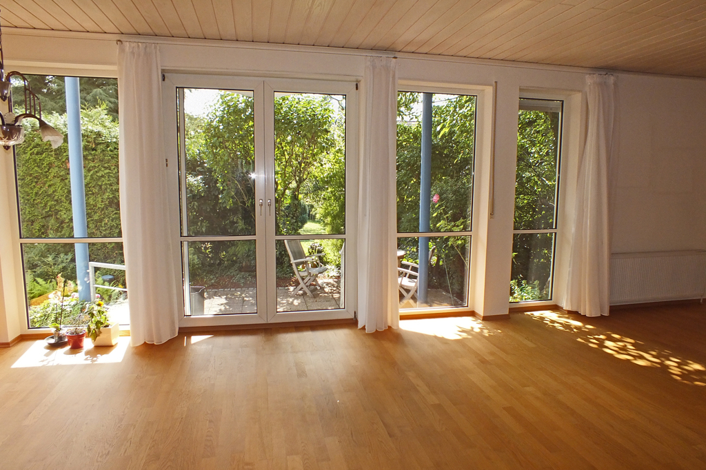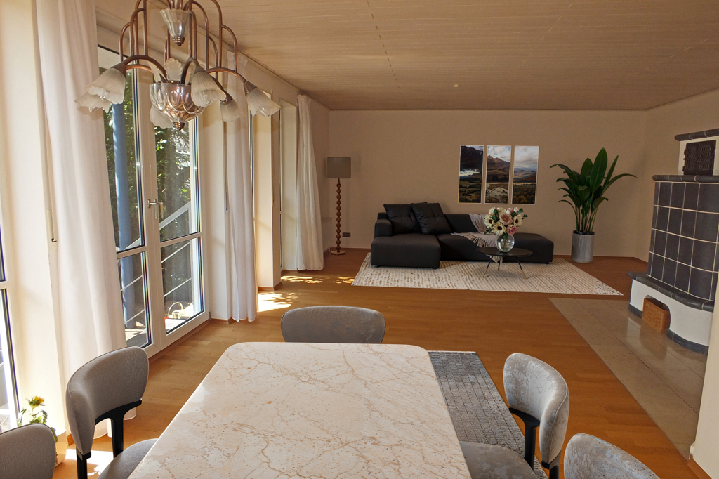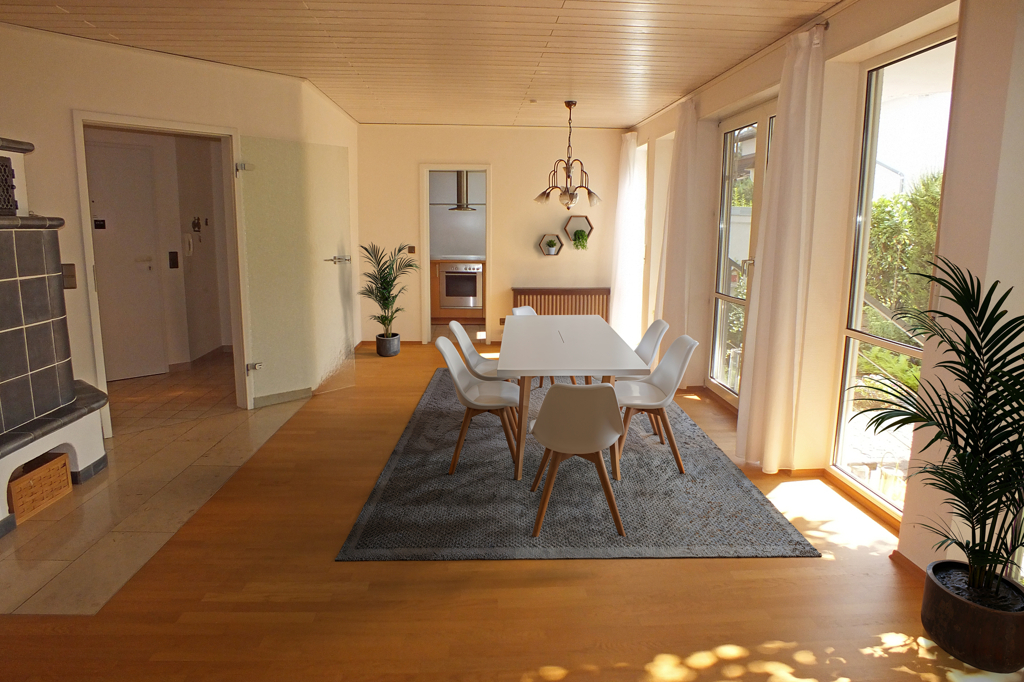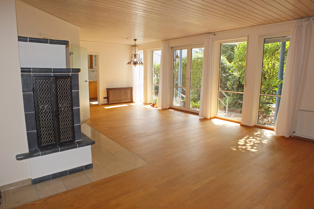 - Großer Wohn-Essbereich mit gemütlichem Kachelofen, sehr hell durch viele bodentiefe Fensterflächen und Zugang zur Terrasse