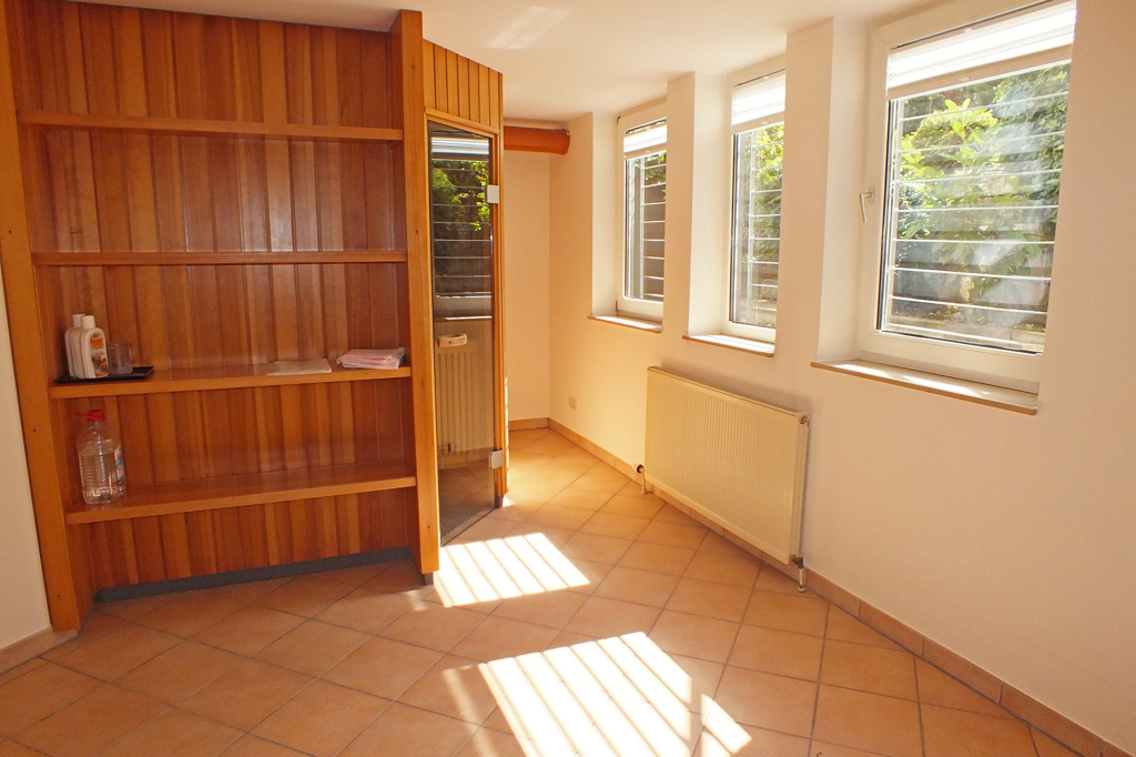 Souterrain-Ebene mit ca. 60 m², einem großen Zimmer, Sauna, Duschbad, Abstellraum, Terrasse und Gartengrundstück