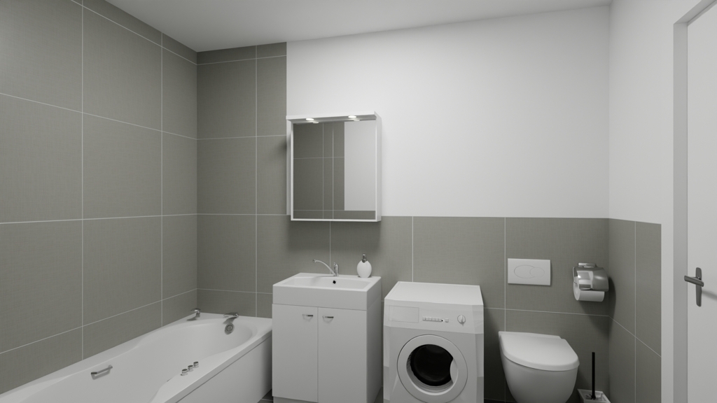 Innen liegendes Bad mit Wanne, Waschbecken und WC und mit Platz und Anschluss für eine Waschmaschine.