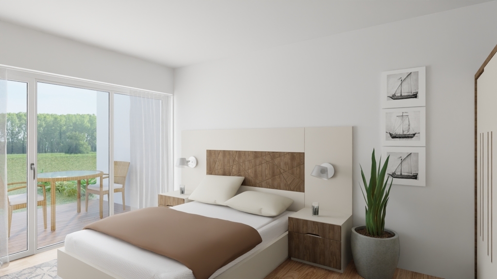 Sowohl Wohnküche als auch Schlafzimmer haben Zugang zur Terrasse.