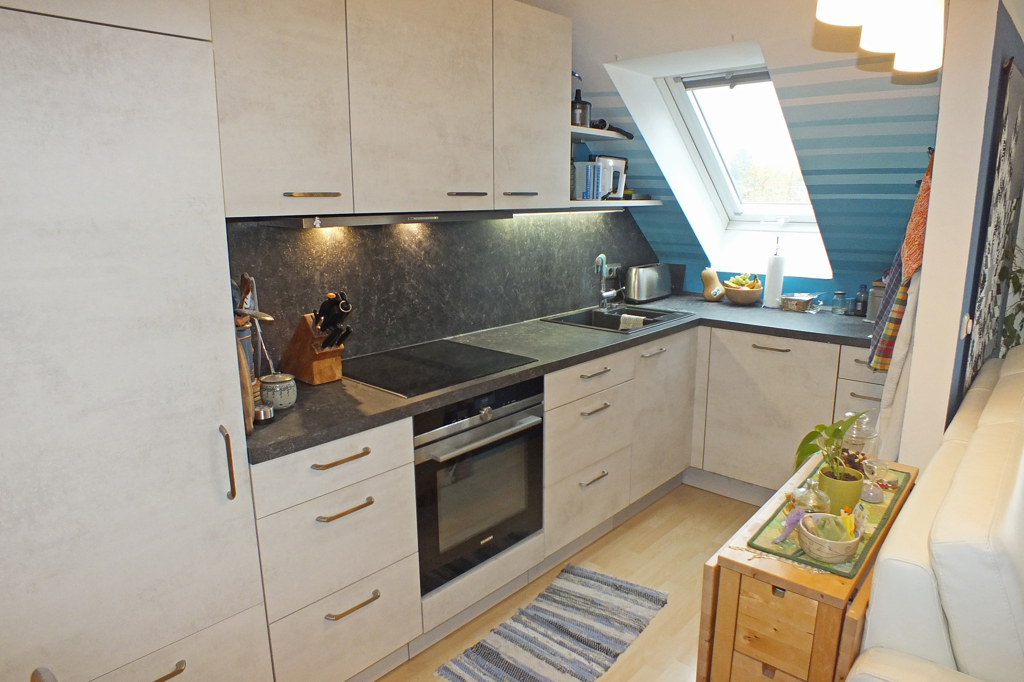 - Gemütlicher Wohn-/Essbereich, mit hoher, heller Gaube und Balkon
