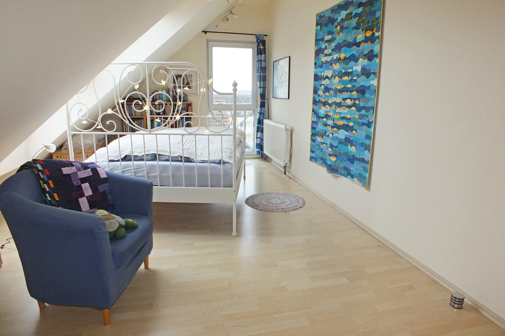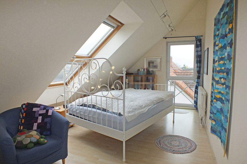 Eine Holztreppe führt zur oberen Ebene in den Spitzboden, der toll ausgebaut ist mit einem bodentiefen Fenster und zwei großen Dachflächenfenstern. Der Raum hat netto 20 m² Fläche und ist perfekt geeignet als Arbeitsbereich, Gästebereich oder als Schlafzimmer wie in der jetzigen Nutzung. Diese Fläche gehört zusätzlich on top zur Wohnung, ist keine offizielle Wohnfläche, sondern ist als 20 m² Nutzfläche additiv zu den 65 m² Wohnfläche zu sehen.