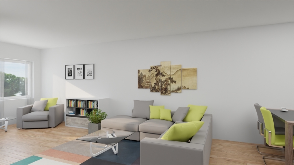 - Sehr großzügig und offen gestalteter Wohn-Essbereich mit ca. 39 m², schön hell durch bodentiefe Fensterflächen, ausgestattet mit Echtholzparkett und Zugang zur Loggia und zur Küche