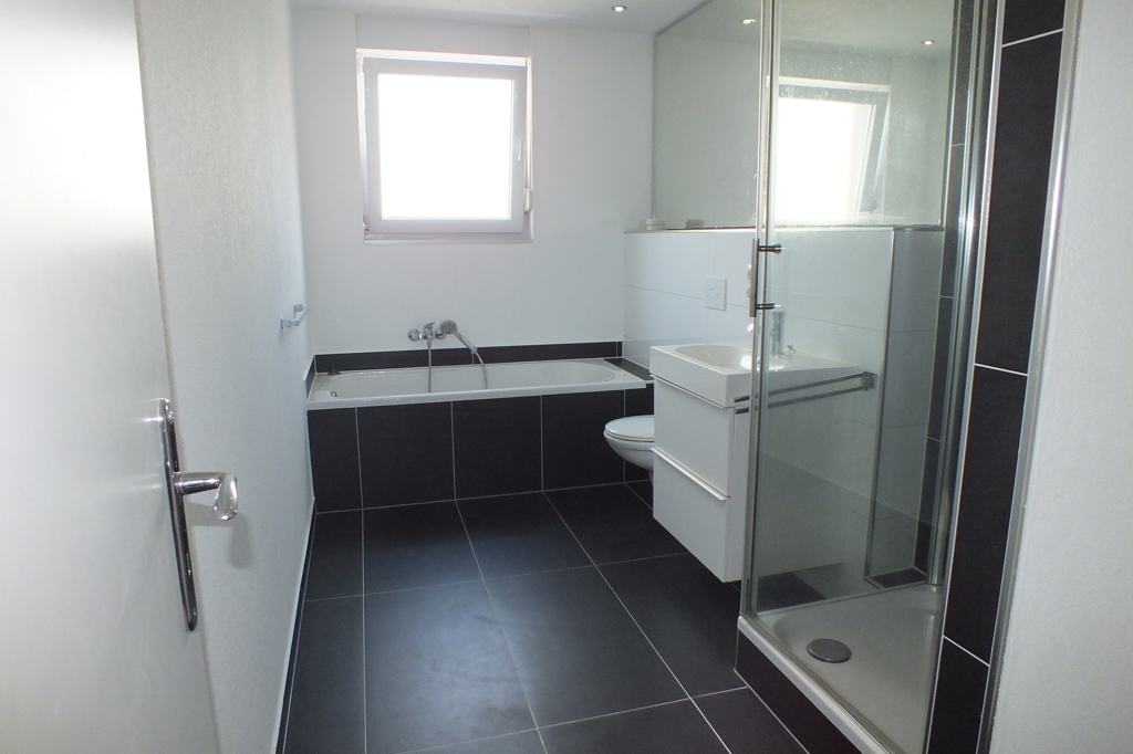 Im Obergeschoss befinden sich 3 Schlafzimmer, das Bad und eine praktische Abstellkammer. Sie könnten auch die beiden Kinderzimmer zu einem sehr großen Schlafzimmer zusammenlegen. Das Tageslichtbad mit Wanne, separater Dusche, Waschbecken, WC und mit Waschmaschinenanschluss ist mit recht hochwertigen Materialien ausgestattet.