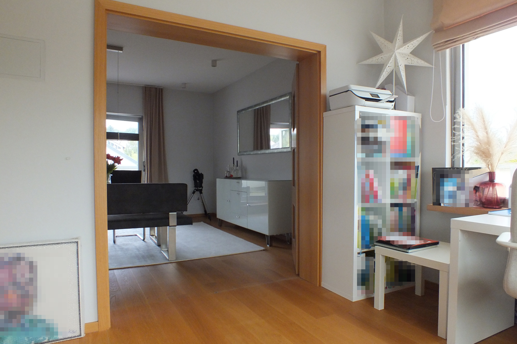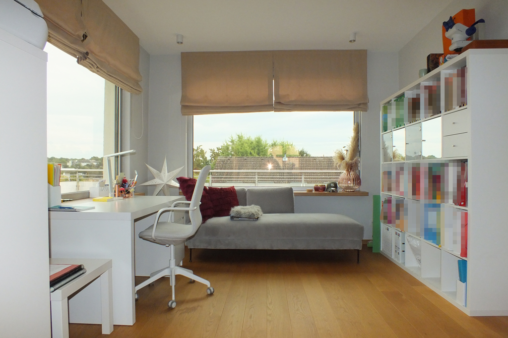 - Arbeitszimmer, ausgestattet mit Schreibtisch und Regalen