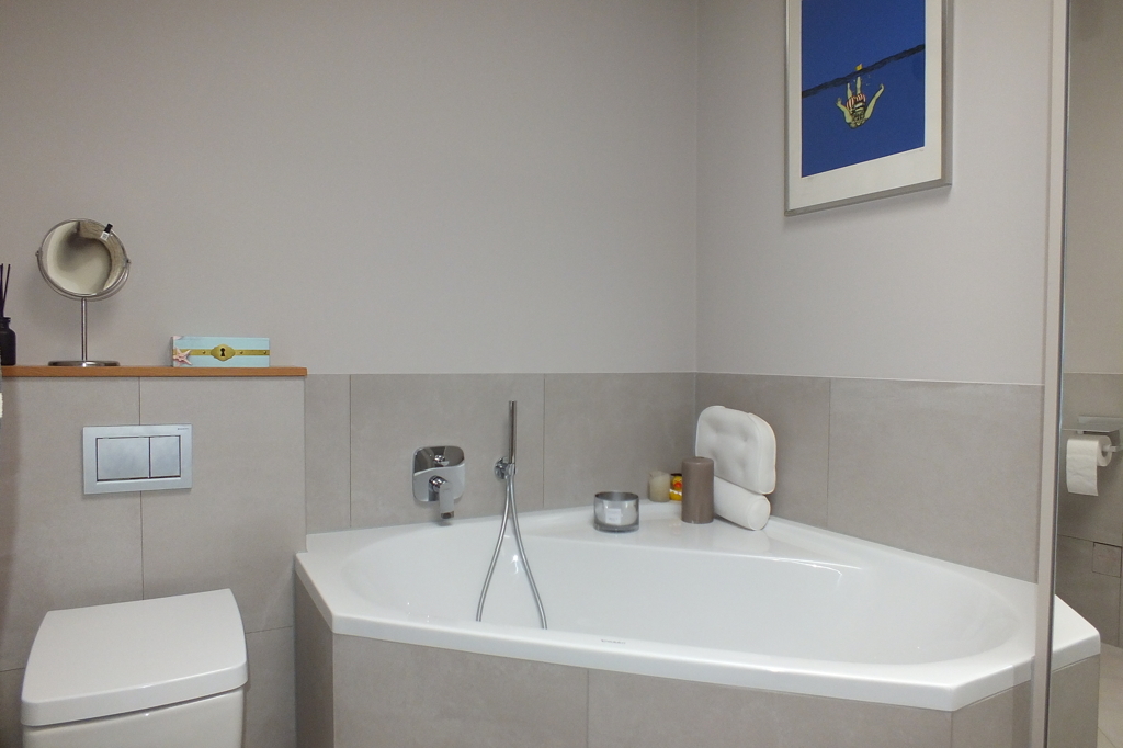 - Tageslichtbad mit Eckwanne, Dusche, WC, Schrank