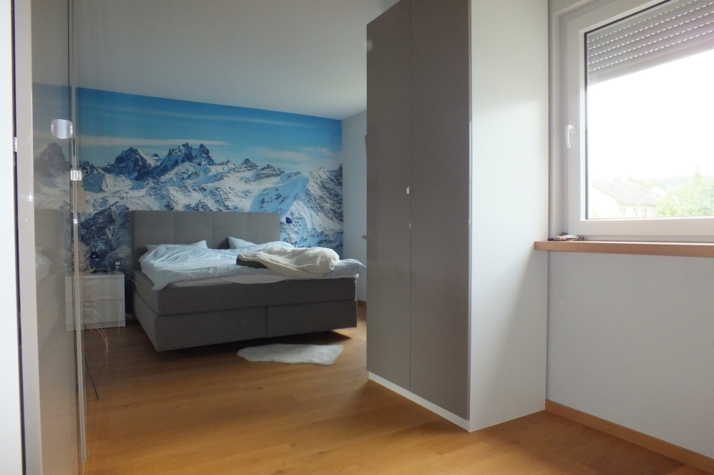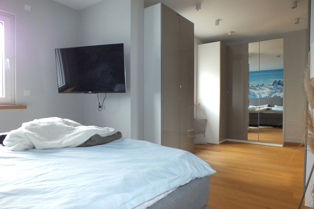 - Elternschlafzimmer mit Ankleidebereich, ausgestattet mit Bett, Kommoden, Schränken
