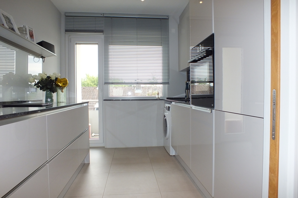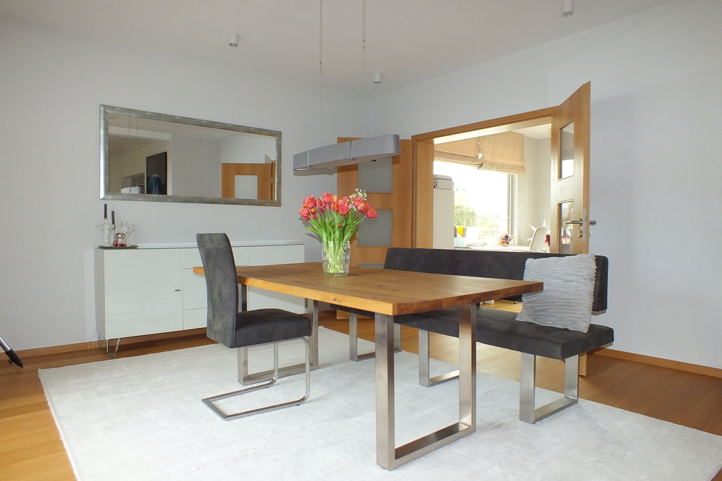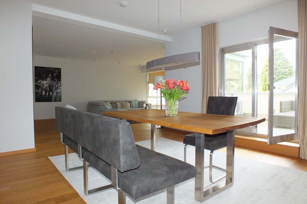 - Einbauküche, umfangreich und hochwertig ausgestattet mit allen Geräten, Geschirr und Utensilien, Kaffeevollautomaten und Waschtrockner, Zugang zu Balkon