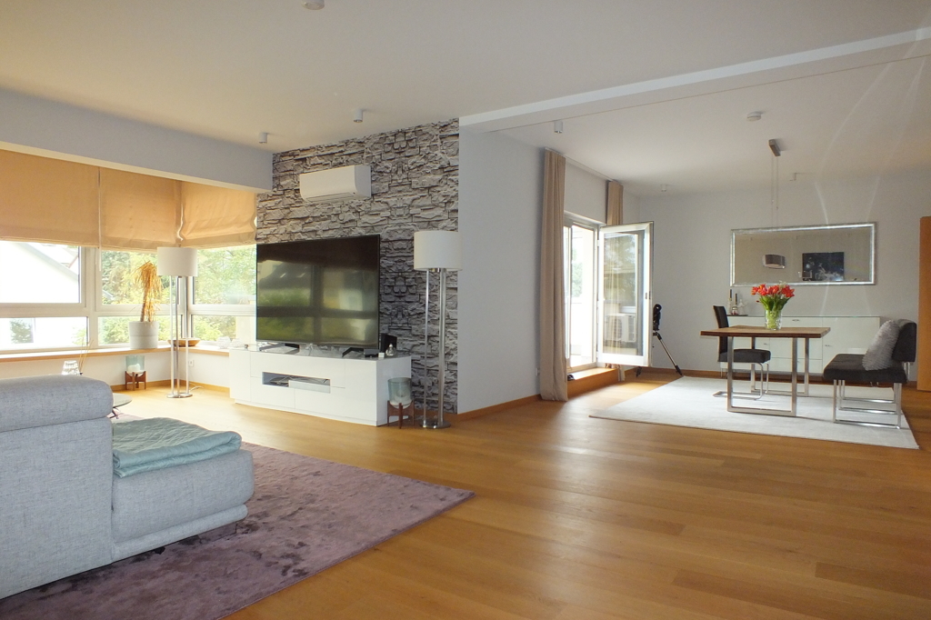 - Riesiger Wohn-/Essbereich (ca. 55 m²), sehr hell durch den Wintergarten und mit Zugang zur Dachterrasse, ausgestattet mit Möbeln für Wohnen und Essen, Fernseher und Klimaanlage