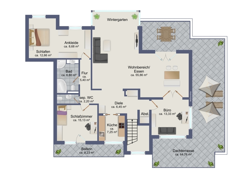 - Dachterrasse umlaufend (ca. 65 m²), ausgestattet mit einigen Terrassenmöbeln und Heizstrahlern