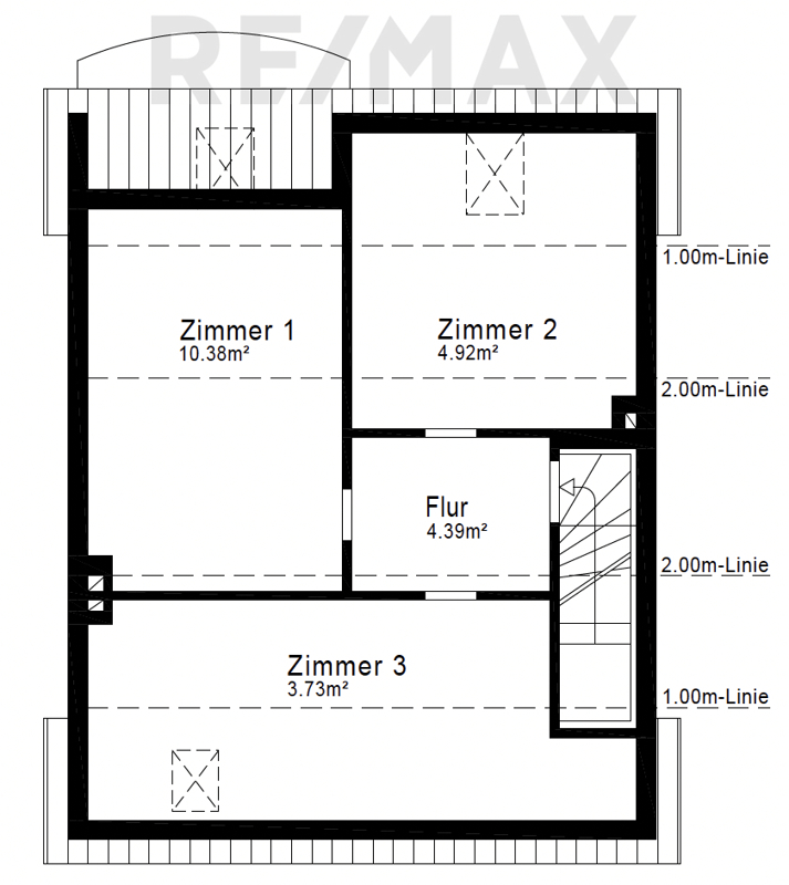 Ausgebautes Dachgeschoss mit knapp 48m² Grundfläche und zusätzlichen 3 Räumen, die unterschiedlich genutzt werden können.