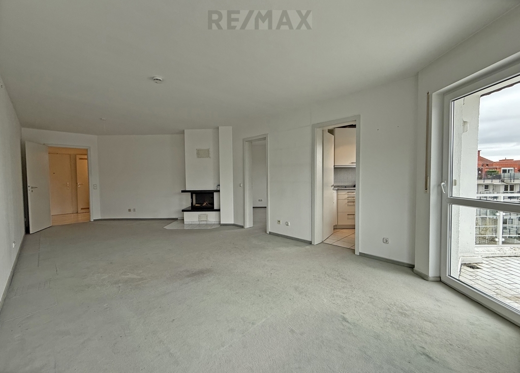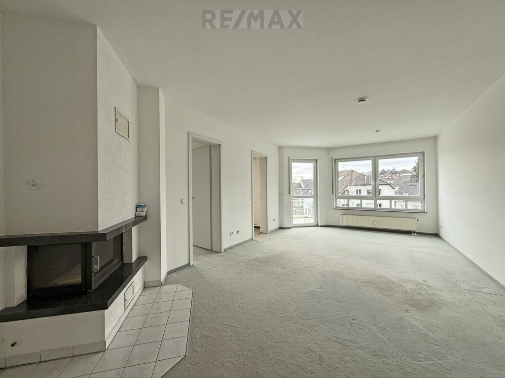 Das großzügige Wohnzimmer überzeugt durch seine Helligkeit und den direkten Zugang zum Balkon, der einen schönen Ausblick ins Grüne bietet. Große Fenster und ein Kamin verleihen dem Raum ein elegantes Ambiente.