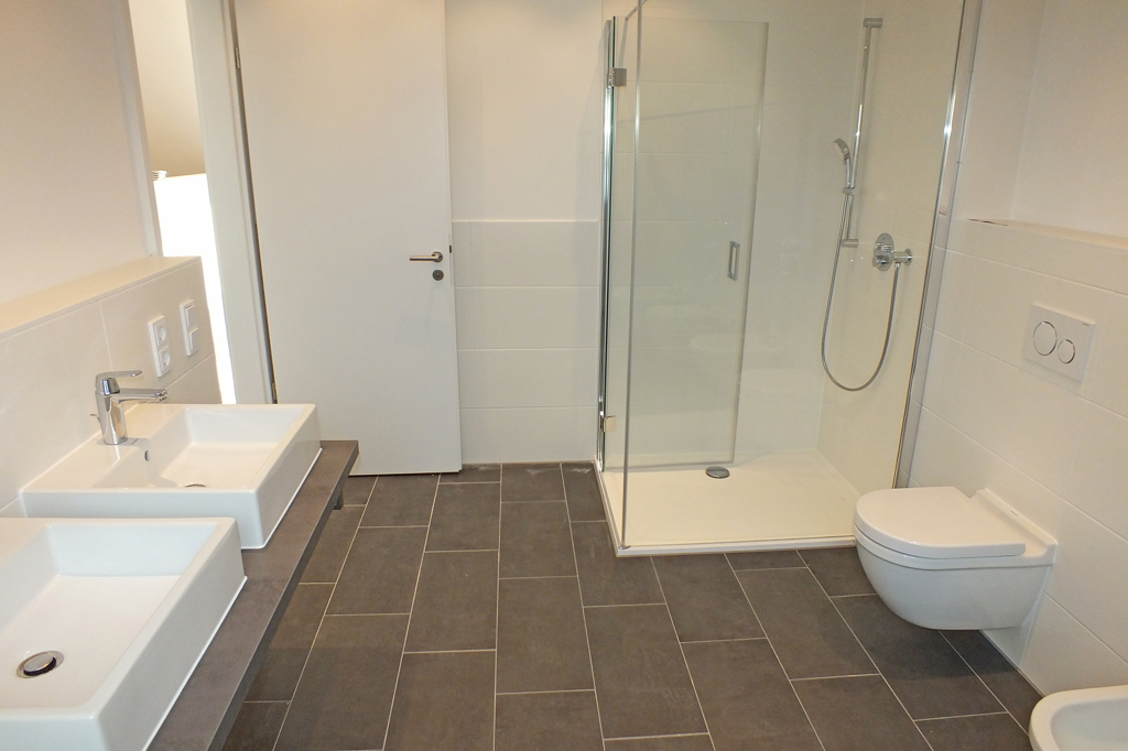 - Ein sehr komfortables Tageslichtbad mit ca. 10 m², ausgestattet mit Dusche, Wanne und zwei Waschbecken