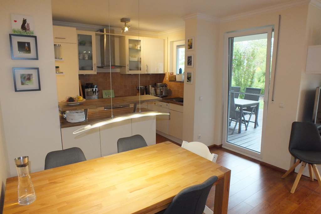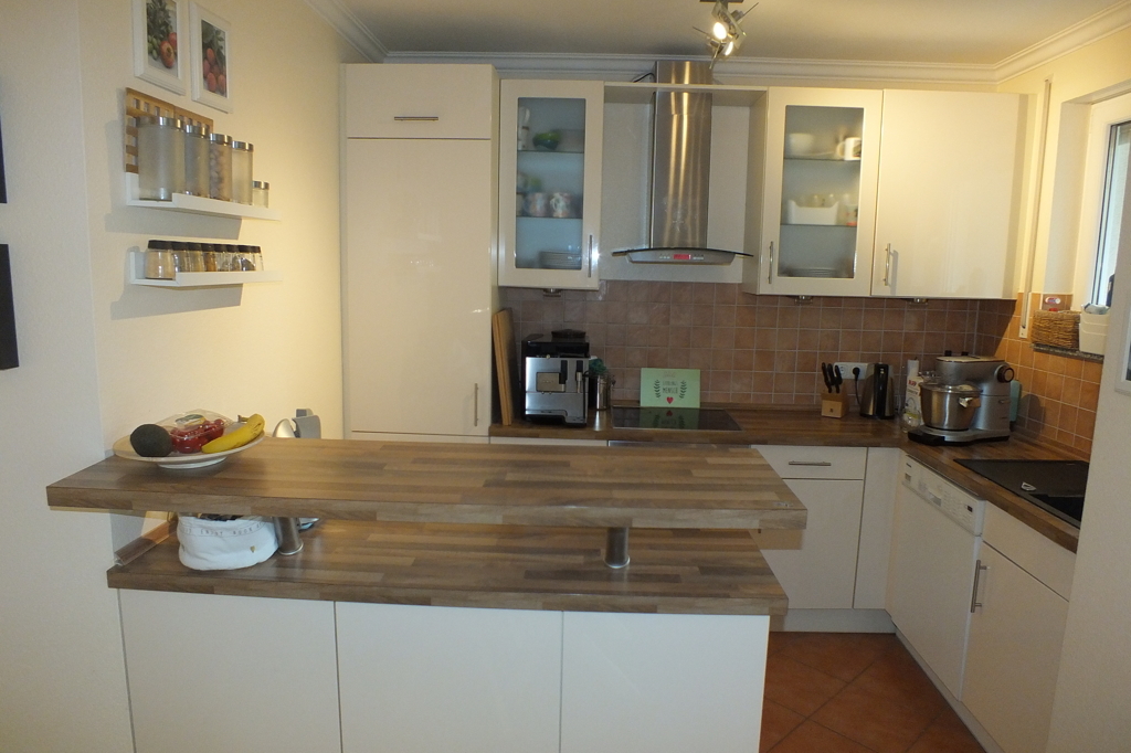 - Die Küche ist inklusive einer hochwertigen Einbauküche, offen gestaltet zum Essbereich und abgetrennt mit einer schicken Küchentheke
