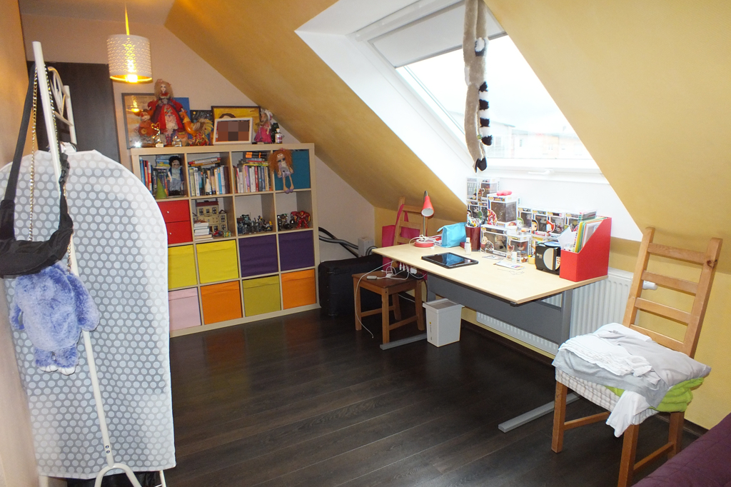 Eine komfortable Wendeltreppe führt in die obere Wohnebene. Dort befinden sich die zwei sehr wohnlich ausgebauten, perfekt als Kinderzimmer nutzbaren und zur Zeit als Kinderzimmer genutzte Räume. Dazwischen noch eine nützliche Abstellkammer.
