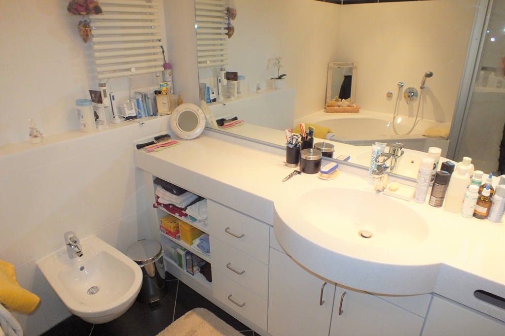 Innen liegendes Bad mit Wanne, Dusche, Bidet, großer Waschtisch mit Unterbauschrank