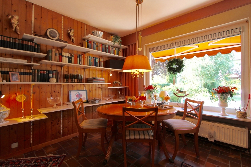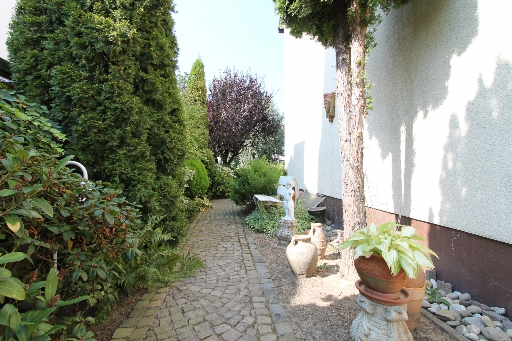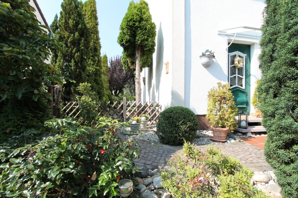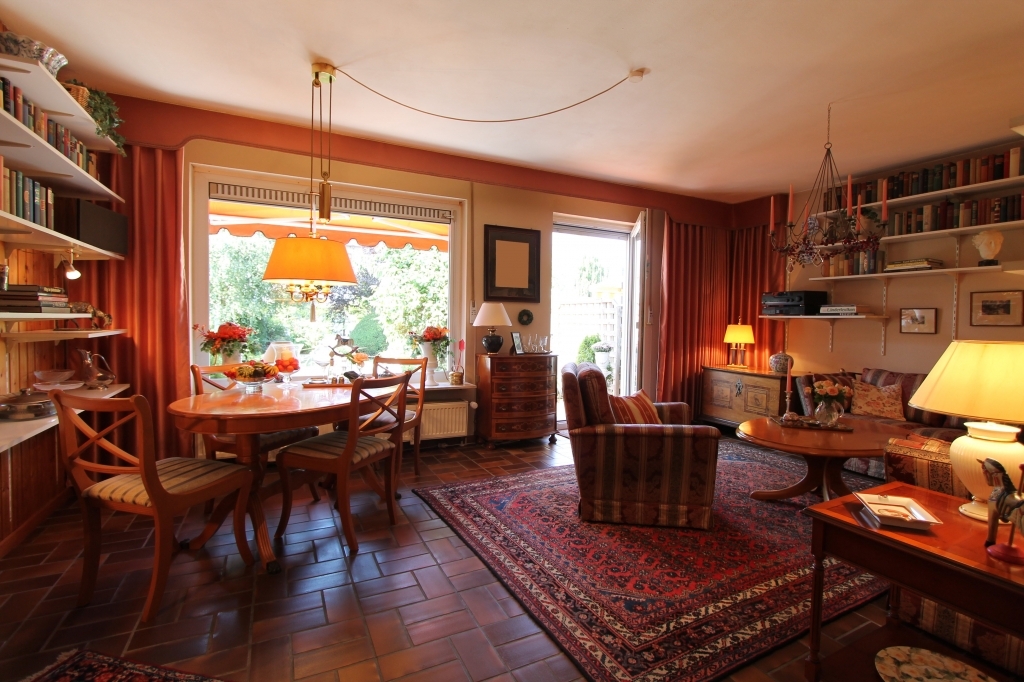 Sie haben einen großzügigen Wohn-Essbereich, hervorragend geschnitten durch die besonders große Hausbreite. Von Ihrer Sonnenterrasse mit Markise können Sie das zauberhafte Flair eines wunderschönen Gartens genießen. Er ist aufwändig und liebevoll angelegt und gepflegt – uneinsehbar bepflanzt, und mit geschmackvollen Pflasterzuwegungen und einer zweiten Terrasse gestaltet. Ihr Gartenparadies für Sie und Ihre Kiddies!