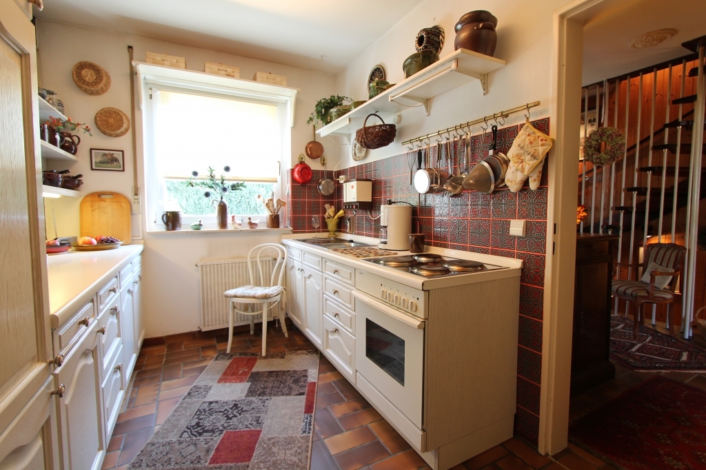 Die Küche ist bereits mit einer weißen Einbauküche im Landhausstil ausgestattet. In der Eingangsdiele mit offenem Treppenhaus ist noch ein Gäste-WC.