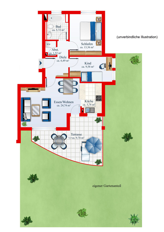 - Ca.100 m² Garten zur exklusiven Nutzung- Süd-West-Sonnenterrasse