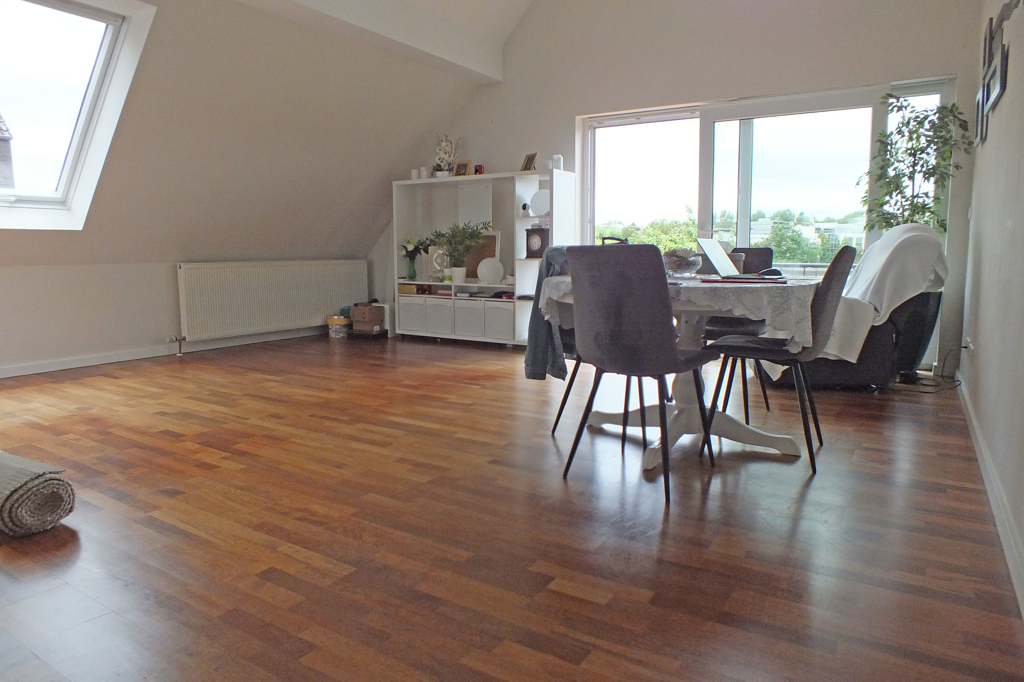 Über ein geschlossenes Treppenhaus mit Türe unten, also keine offene Wendeltreppe wie oft üblich, erreichen Sie ein großes Dachstudio mit ca. 17 m² Nettowohnfläche (Grundfläche über die volle Länge des Hauses.
