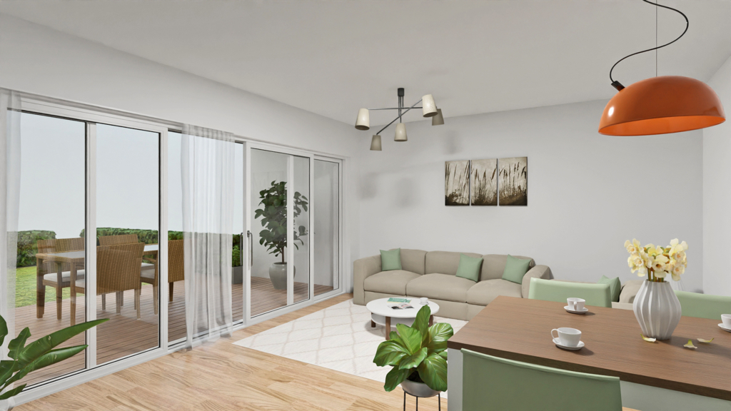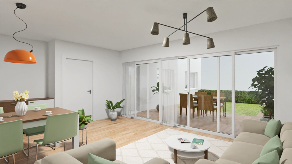 - Wohn-Essbereich mit großen, bodentiefen Fensterflächen und Zugang zur Terrasse und Garten