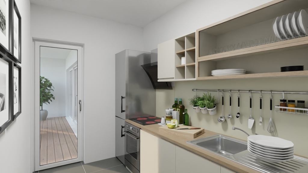 - Die Küche hat ebenso einen Zugang zur Terrasse und ist inklusive einer Einbauküche.