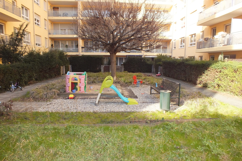 Auch die junge Familie mit einem Kind wird sich hier wohlfühlen, mit der eigenen Terrasse und dem kleinen Gartenanteil, und hinter dem Gartenausgang ist noch ein kleiner Kinderspielplatz.