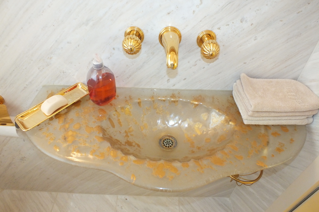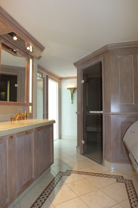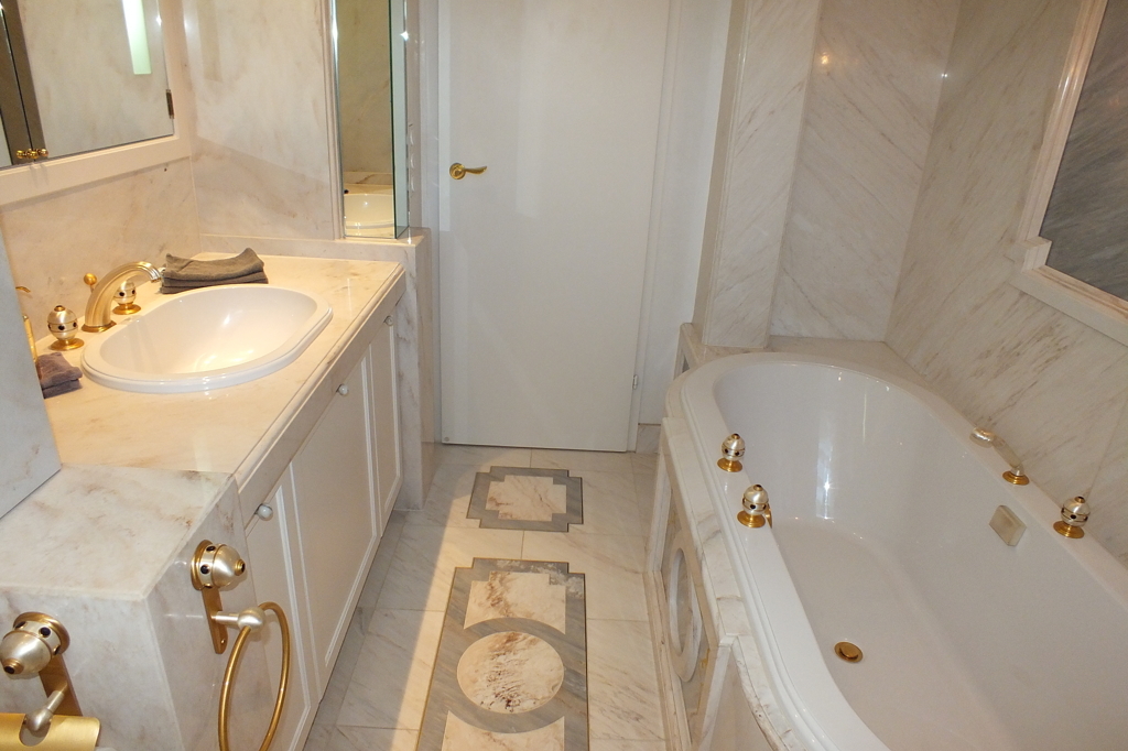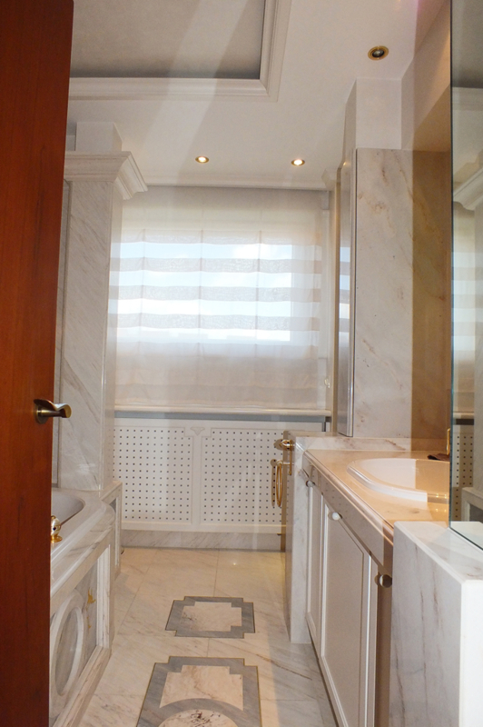 - Bad ausgestattet mit säulenverkleidetem Waschtisch sowie Badewanne, alles aus feinstem Marmor, edlen Armaturen und mit vielen Details ausgestattet, WC