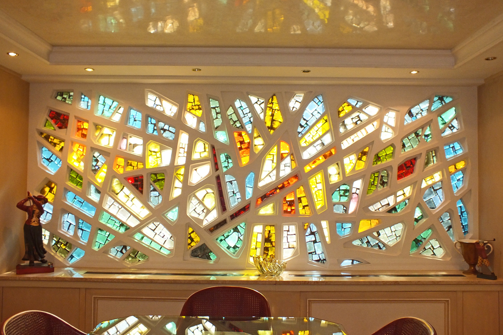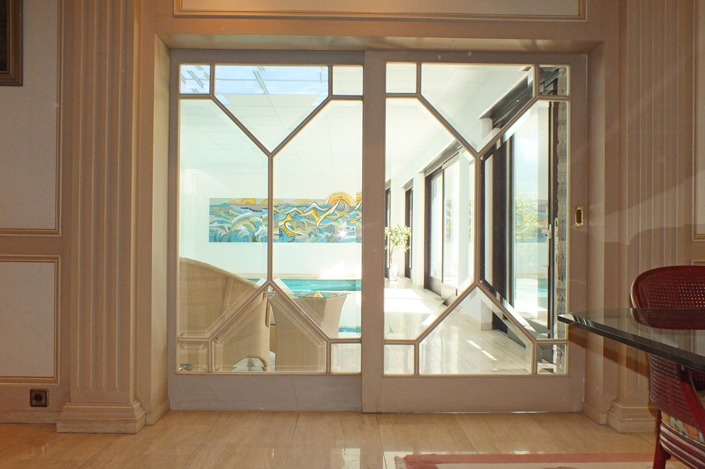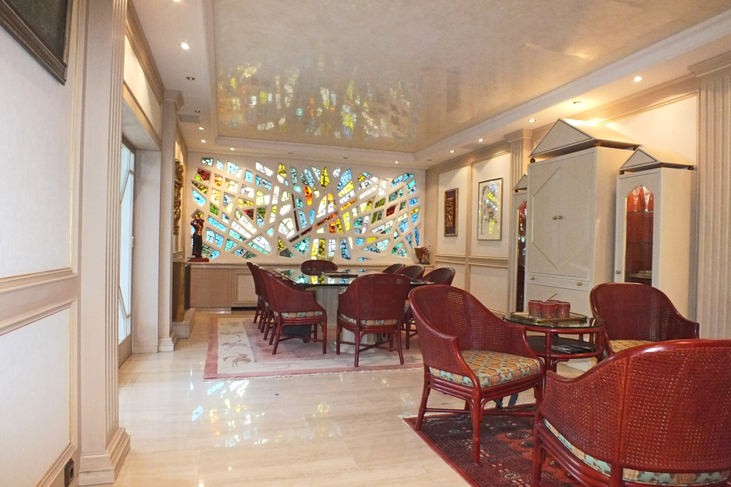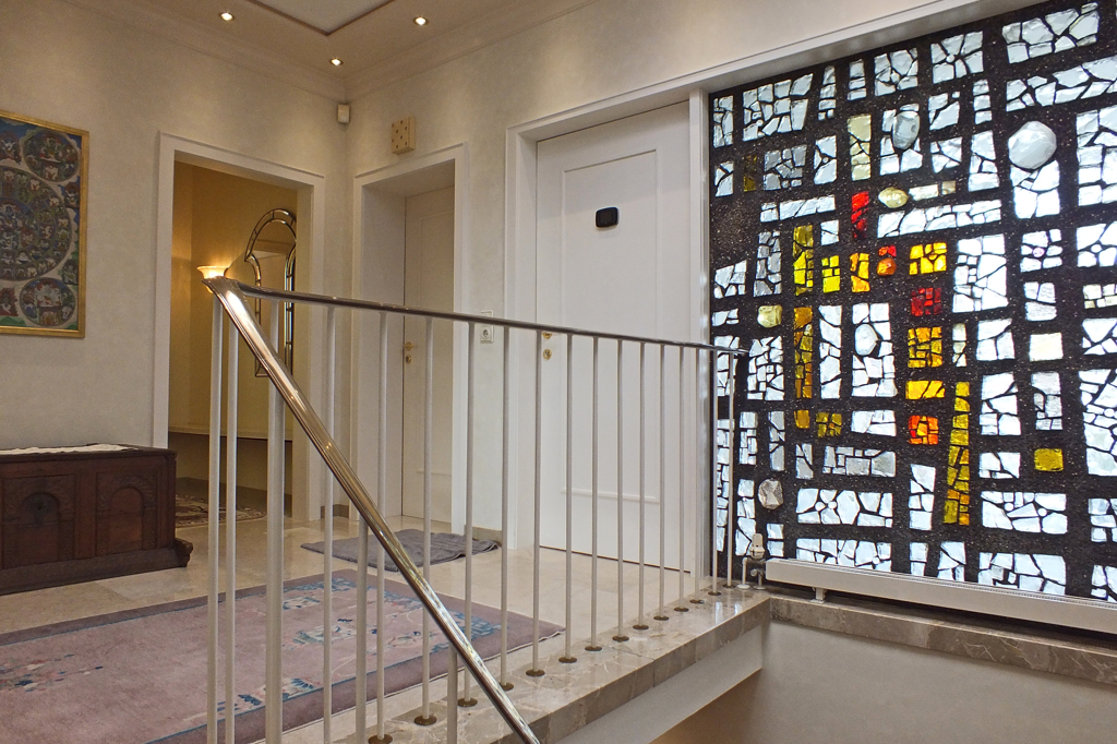 - Große repräsentative Lounge (ca. 37m²) für Ihre Gäste, mit Kamin, fein vertäfelt und voll ausgestattet, der besondere Blickfang hier: Fenster mit einem Farbenspiel aus Glasmosaiksteinen, die Auftragsarbeit eines Künstlers mit einem wunderschönem Lichtspiel in den Raum hinein