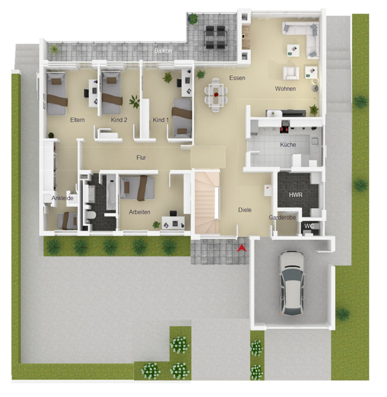 - Großzügiges Entree mit Garderobe auf ca. 16 m² (auch Zugang Garage)