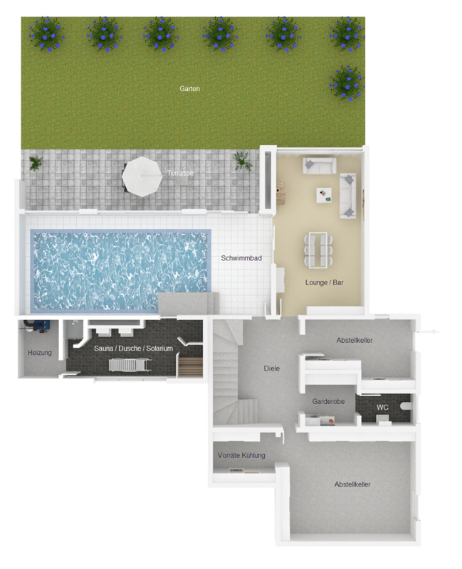 - Schwimmbadbereich (ca. 66m²) mit großem Becken und Zugang zu Terrasse und Garten