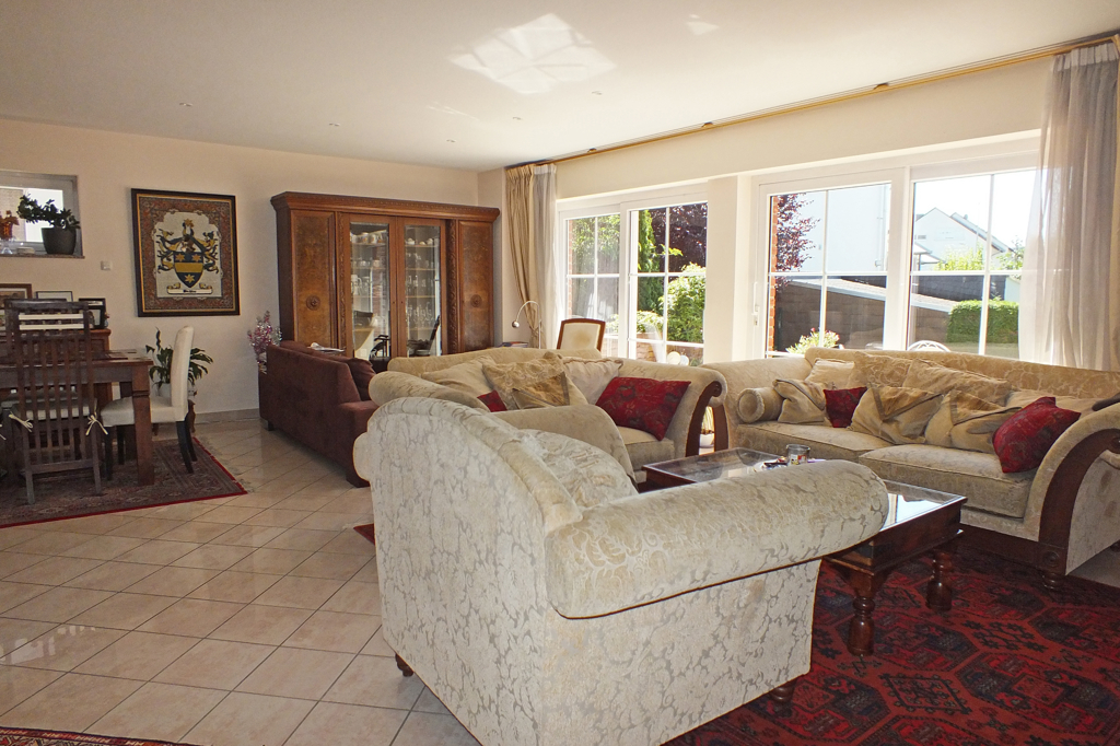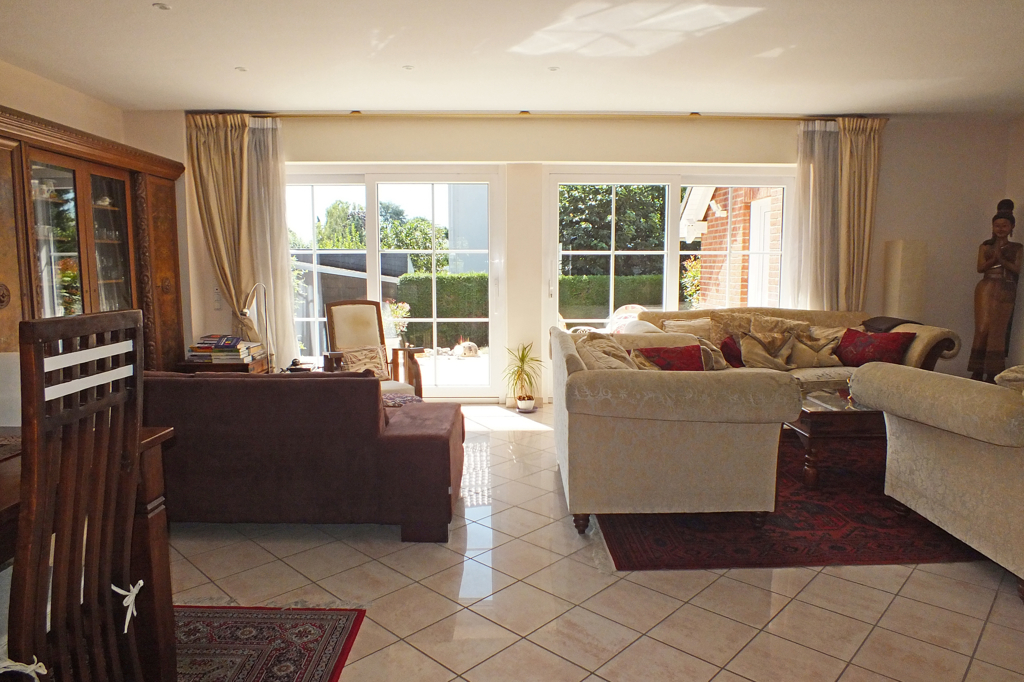 - Sehr großer Wohn- und Essbereich mit ca. 53 m² mit großen bodentiefen Fensterflächen über die gesamte Hausbreite, Fenster und Licht von zwei Seiten.