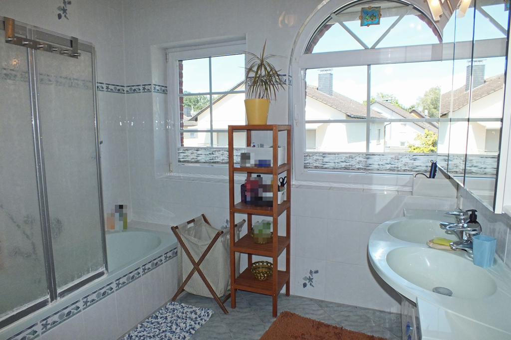 - Tageslicht-Kinderbad mit Duschwanne, Doppelwaschbecken und WC