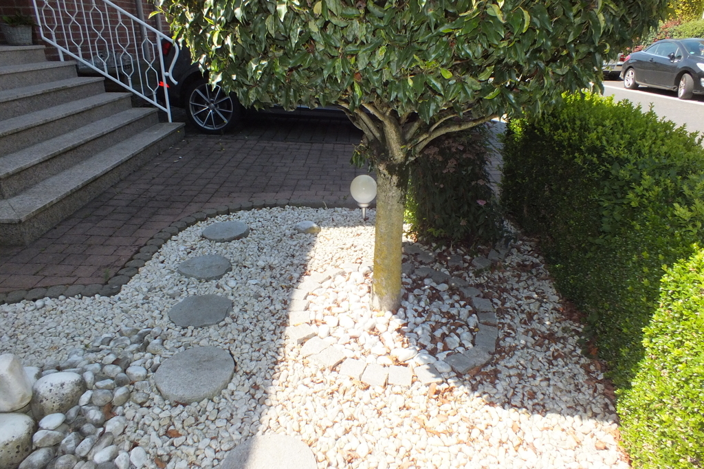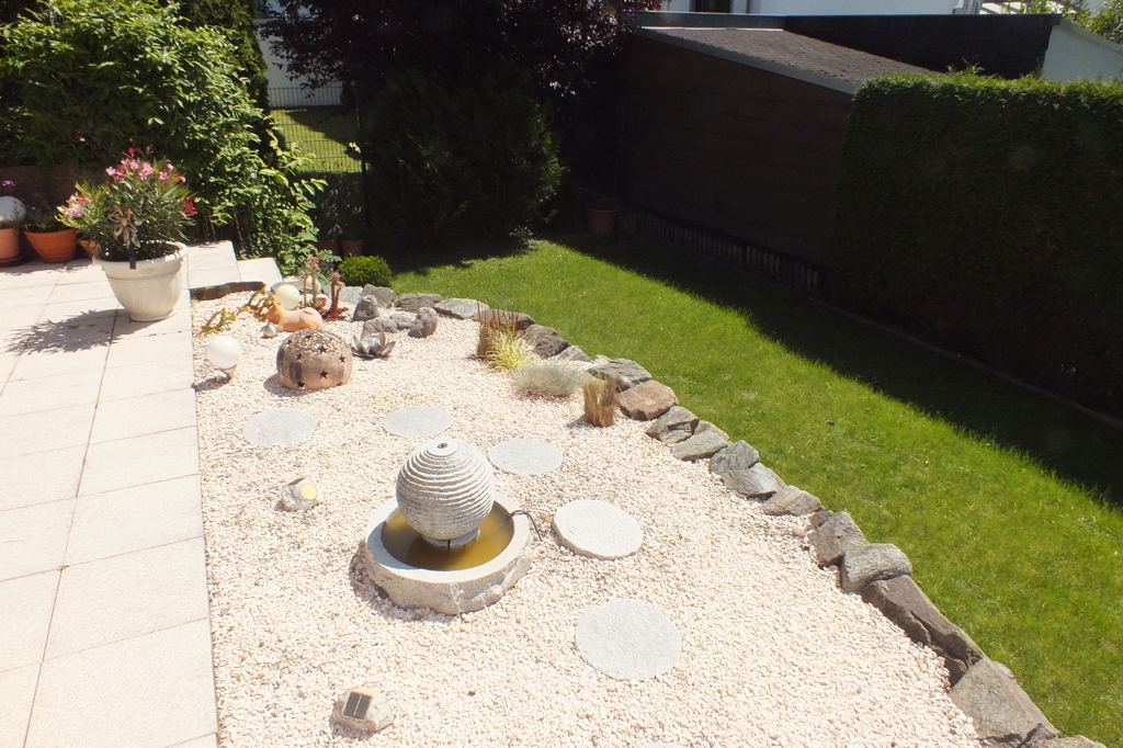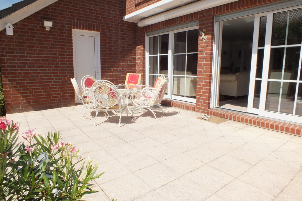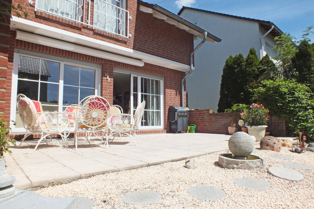 - Große Terrasse mit hellen Steinplatten, Geräteraum und pflegeleichter Garten